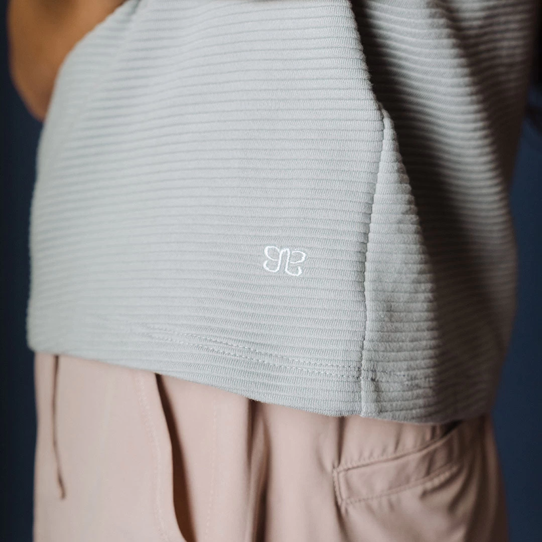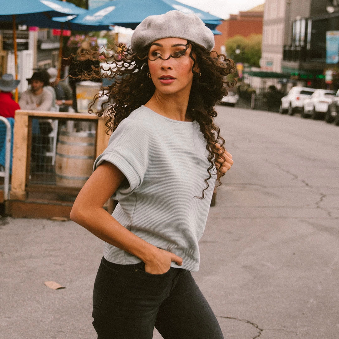 A soft tee, but in disguise! With a ribbed fabric and a statement sleeve, no one will ever guess how comfortable this grey blouse is. Pair it with a