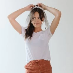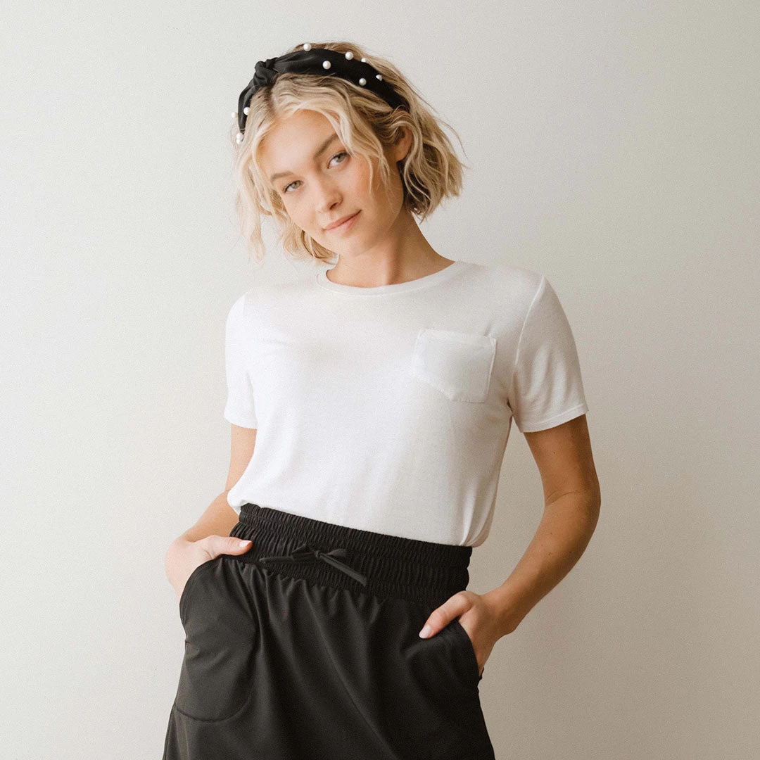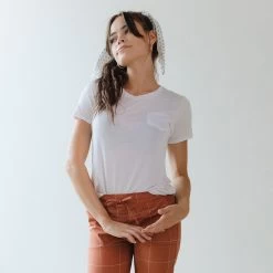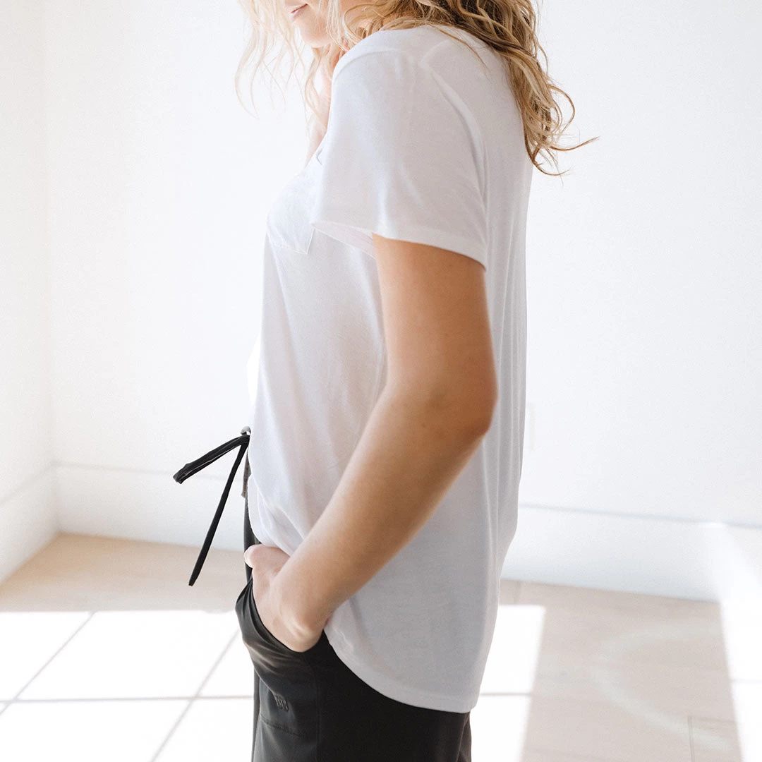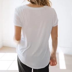 The perfect womenโs white tee shirt has arrived in your favorite Albion fabric. Once you try on our ultra soft rayon spandex, you’ll never go back. This tee hits mid-length with a relaxed and flattering fit. A crew neck, curved hem, and pocket add just the right details. Youโll want more than one!