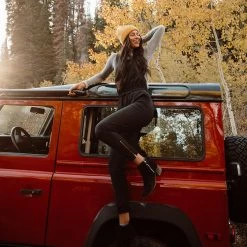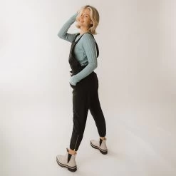 Our Classic Overall Jumpsuit in black features a square neckline, front and back pockets, cinch waist with tie and everyone’s favorite Jetsetter jogger bottoms with gold zippers. This fun new spin on our best-selling ladies jumpsuit provides freedom with adjustable straps to criss-cross or button-in straight. Click