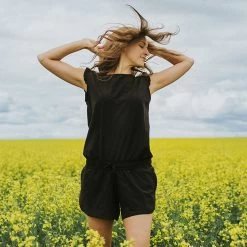 Squat, jump, dance, skip, or sprint in our new one-piece, black romper. Built like Albion Fit sprinter shorts on the bottom, this romper is the perfect length for movability and coverage. This casual romper has an elastic drawstring waist (plus pockets!) and transitions to a relaxed tank top. Trimmed with sweet ruffles and a zipper at the back this women’s romper is a NEED. Whether you’re hitting the tennis courts, heading to the beach, or pairing it with cute sandals for a date, this is your go-to for easy, cute, and comfortable style.