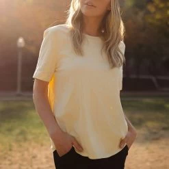 Our most classic tee, now in a light yellow! The Boyfriend Tee has a relaxed fit, with a slightly longer sleeve than our original Basic Tee. Casual, comfortable, and easy to accessorize, this yellow tee is a sunny favorite!