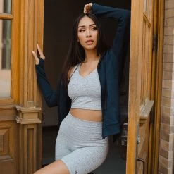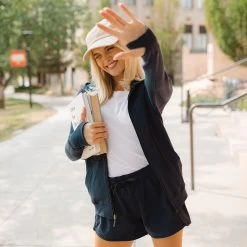 Your new favorite go-to sweater is here! This navy zip up hoodie goes with any outfit, and is perfect for layering on a cold morning, and stashing in your backpack in the afternoon. Stay cool on campus in this hoodie with reinforced thumb holes, a wide, flattering hood, and contrasting black zipper and strings.