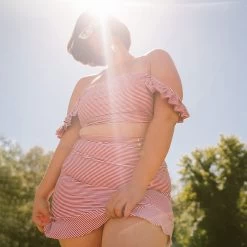 Nothing is more “summer” than these patriotic stripes! Our red pinstripe swimsuit top features an adorable ruffle that is perfect as an off-the-shoulder look or a supportive bikini strap.
