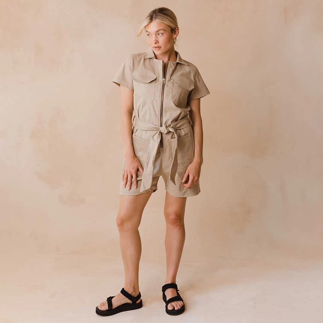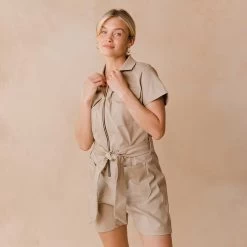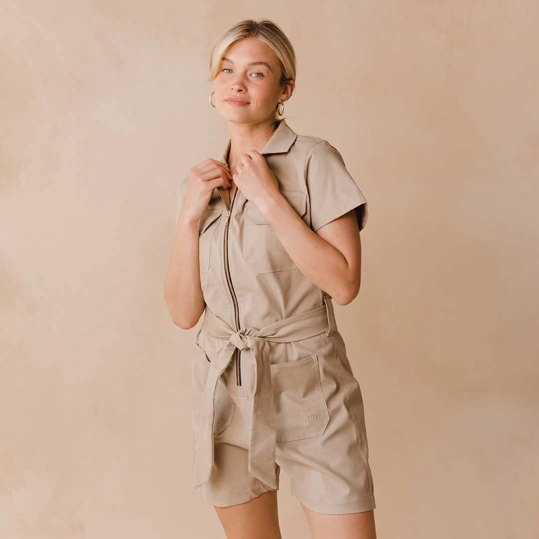No more fussing around with outfit decisions. Our City Romper is your new one and done go-to fit! With a preppy collar and the cutest belted waist, you need this neutral tan piece.