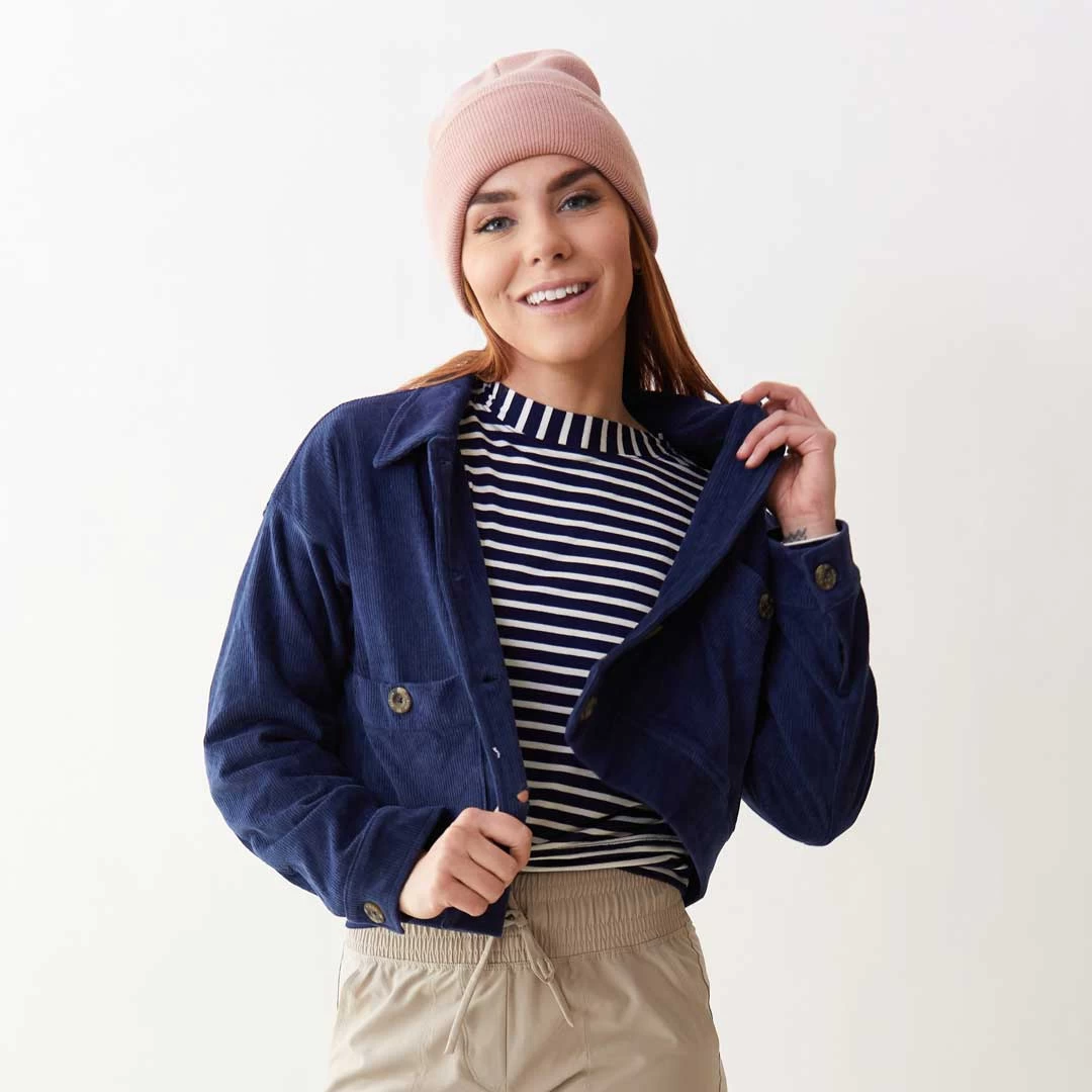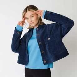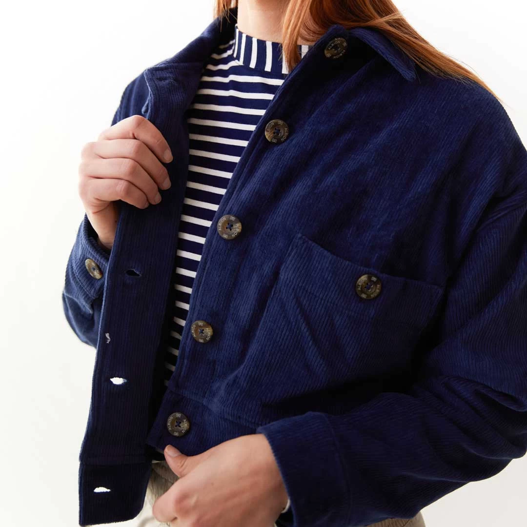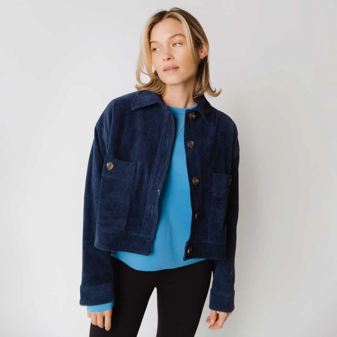 The perfect mid-weight jacket, thisย dark blue button-up is a wardrobe staple. With adorable Albion buttons and the softest corduroy fabric, this top is just waiting to be worn all year round!ย