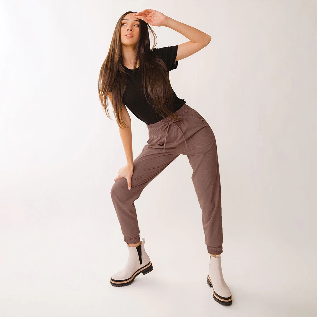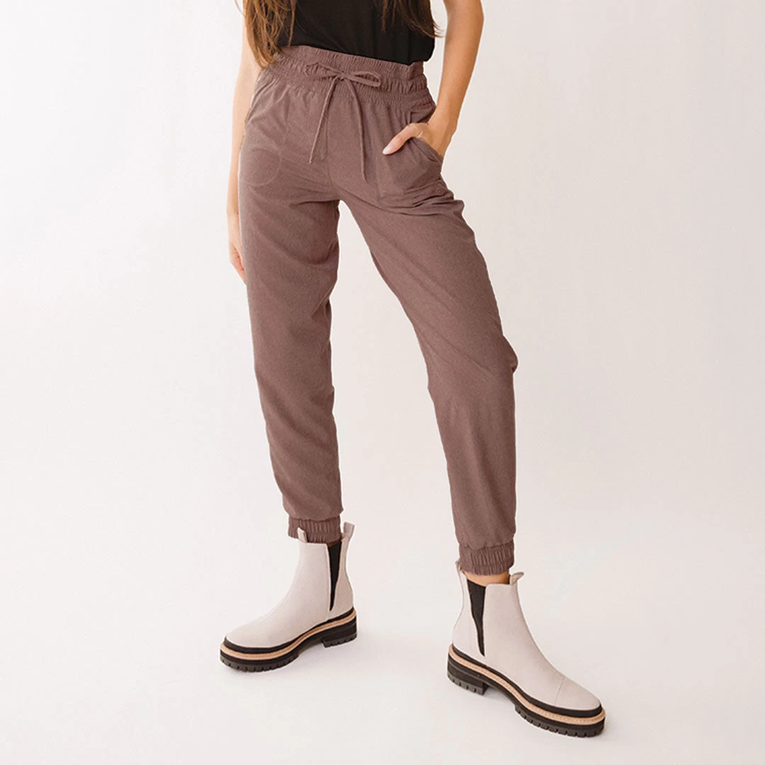 A highly requested color in a highly requested style! Meet our new Destination Joggers in a heathered maroon shade. These women’s jogger pants feature a 3″ high waisted band, a wider ankle cuff, and our fave wrinkle-free fabric.