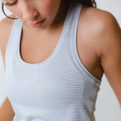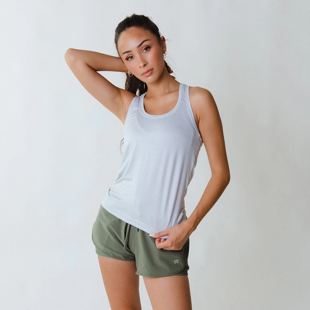 Guns out, ladies! Our racerback tank is the perfect mix of comfort and strength, with a sporty cut that feels and looks amazing. Soft green stripes bring some fun to your workout, and are the perfect match for sage Lunge Shorts!