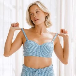 Meet the Hailey Crop! With supportive underwire and removable straps, this vintage-inspired bikini top is best worn with a wide brimmed hatย sipping lemon waterย at the pool. In a baby blue gingham print we can’t get enough of!