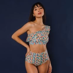 This one’s for the girls! It’s our one shoulder bikini top with a ruffle neckline in a colorful playful print, perfect for a lifetime of beach days. If you want a suit that’s comfortable, supportive, and stylish, this top’s for you!