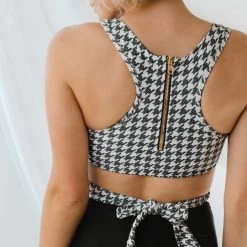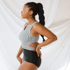 One of our most popular silhouettes, The Castaway,ย in a timeless two-toned style. This full coverage swimsuit features our new houndstooth print, a zipper at the back, and a tie waist that shows off your cute waist. This monokini swimsuit will be your favorite for any beach or pool day!