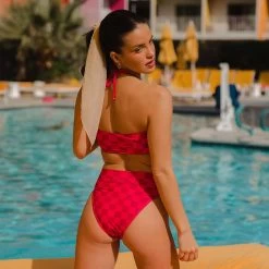 These flirty french-cut bottoms are made with our fun pink checker pattern, guaranteed to make the room blush. With a leg-lengthening cut and a waist-defining band, these Almost Cheeky Bottoms are a winner!