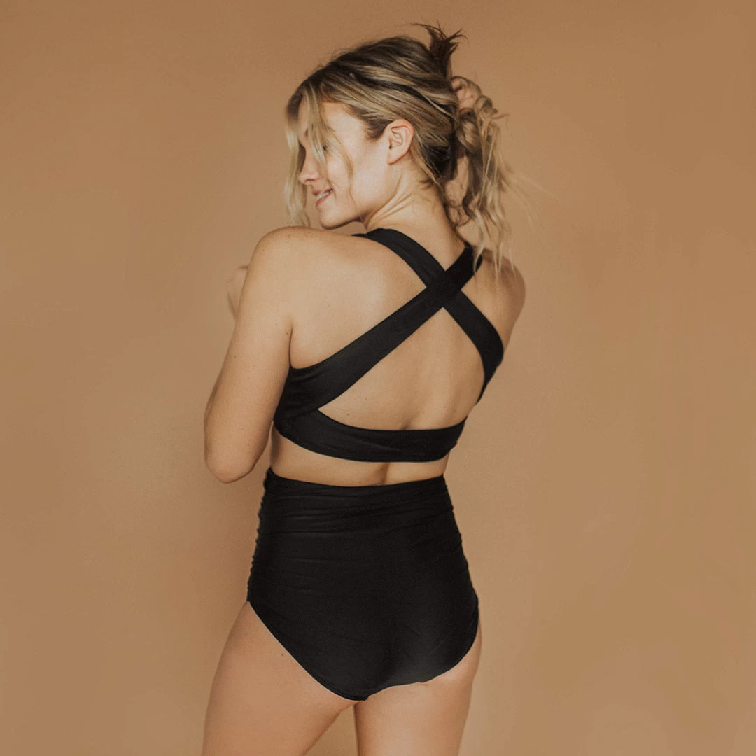 Everyone needs a matte black bikini and this timeless swimsuit is the perfect combination of sporty and cute! Criss cross straps at back keep you supported while a tie knot at front adds a vintage flair and feminine detail. More coverage than a regular bikini and cute as ever.