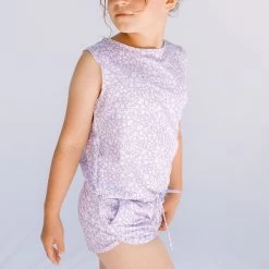 This floral jumpsuit cannot get any cuter. Tiny florals on the most beautiful purple romper, this is going to be the go-to outfit of your little girl’s dreams!