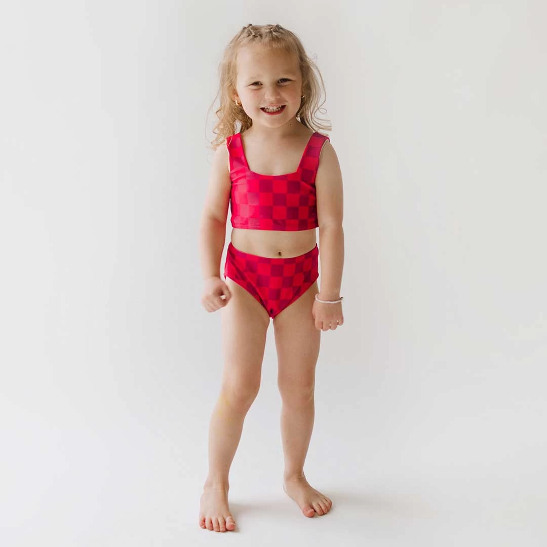 Match your mini inย our Mini Olivia Two-Piece Set! In a magenta check pattern,ย this sweet pink check two piece will bring a playful pop of color and style to any summer day. Ready, set, swim!