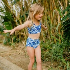 A brand new style perfect for kid-sized adventures! The Olivia top is a sporty crop with a square neck, perfectly paired with high-waisted bottoms. Your girls will be ready for adventure in this blue and white floral print set, and it’s perfect for a