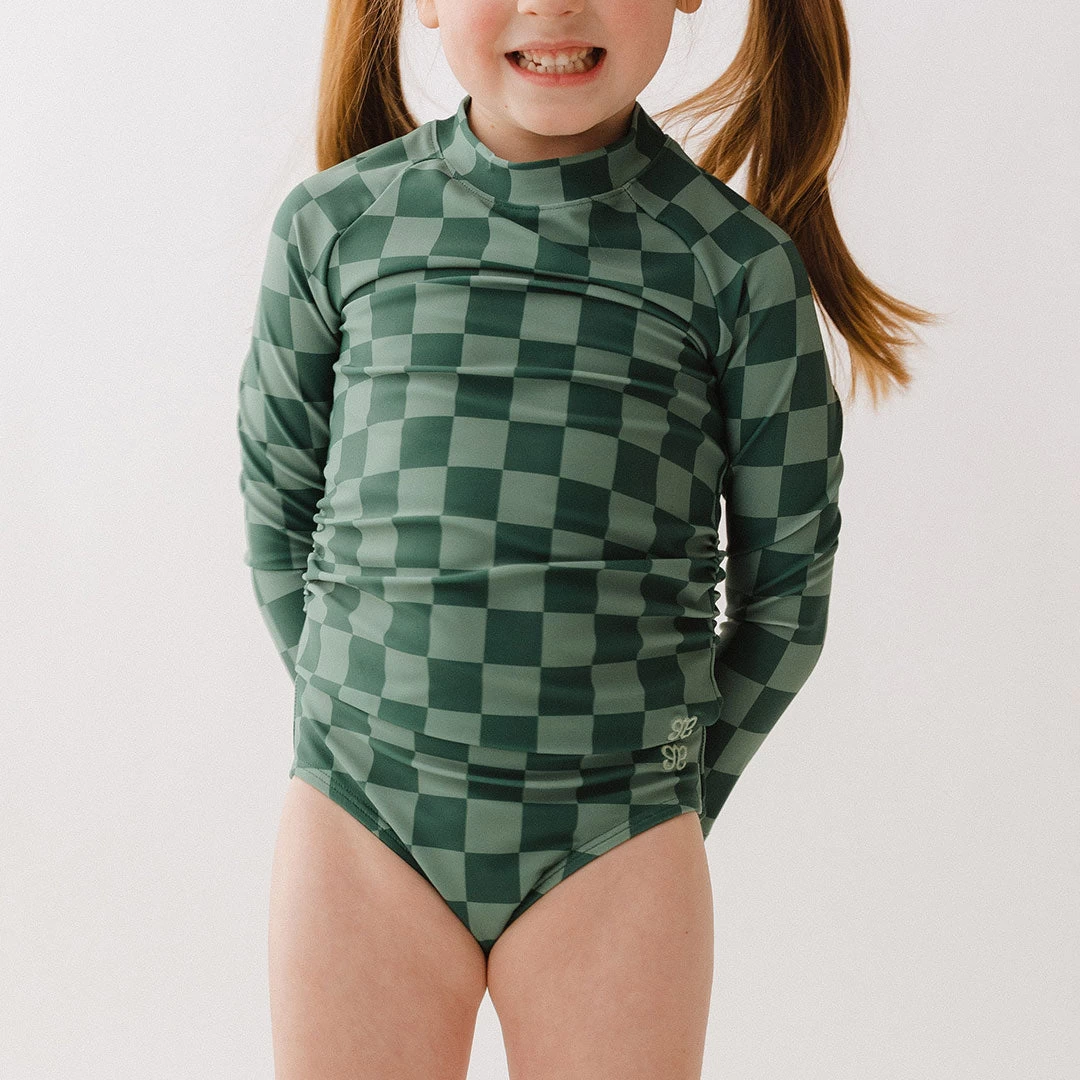 Match your mini with this Mini Rash Guard Two-Piece Set in Green Check! This long-sleeve swim set is a must-have for your little! We’re talking extra sun protection and comfortable, soft swim fabric that doesn’t dig or snag!