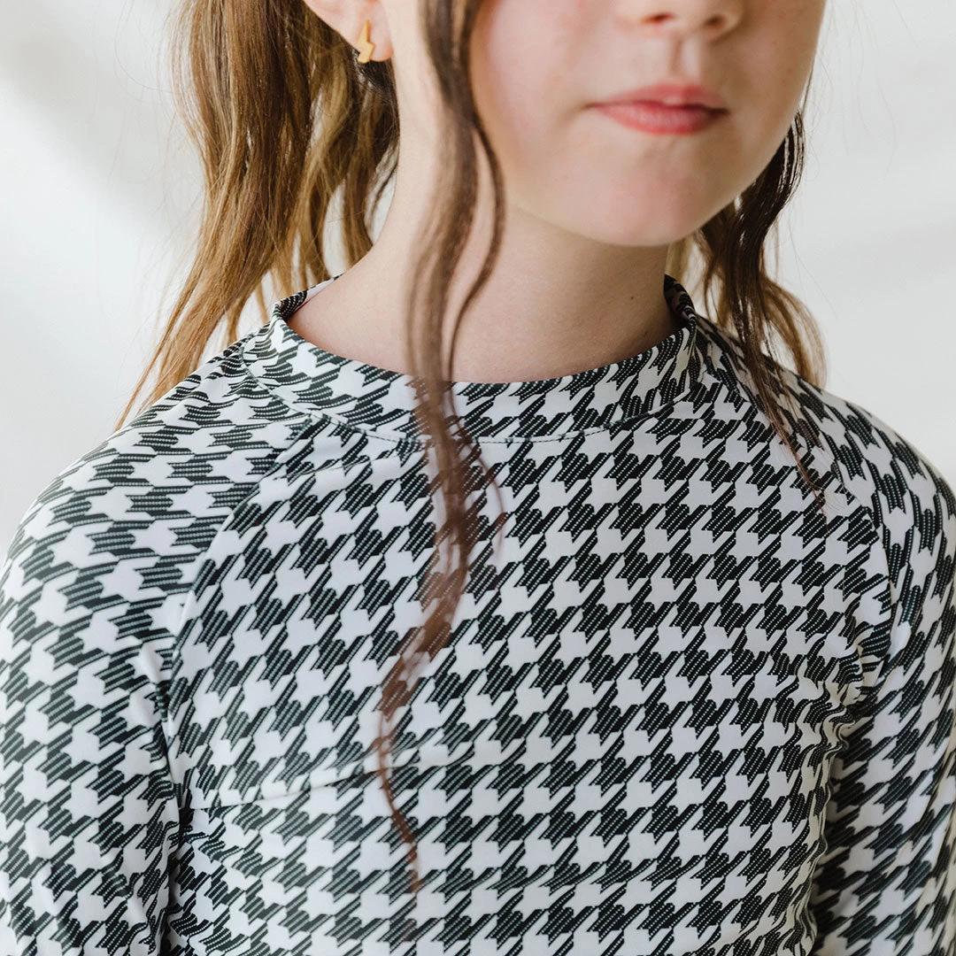 Houndstooth isn’t just for sophisticated big kids– match with your mini this summer in coordinating swim sets when you’re on vacay! Lather on that sunscreen and then throw on this rash guard for another layer of protection while looking your best.