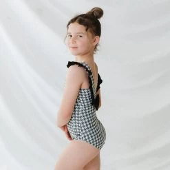 Thisย one piece houndstooth swimsuit makes for one stylish looking little with a timeless print and statement ruffles. Oh and bonus: There’s a set for you too! Coordinate with your little and make family pics dreams come true.