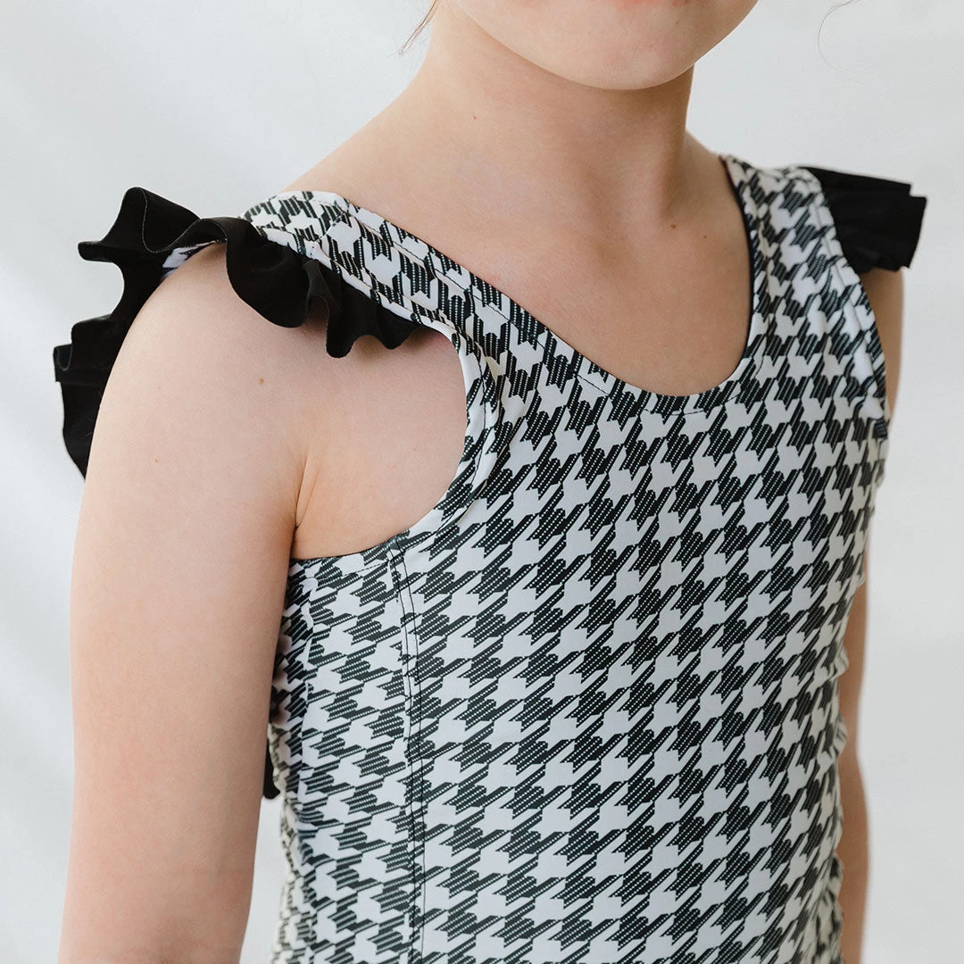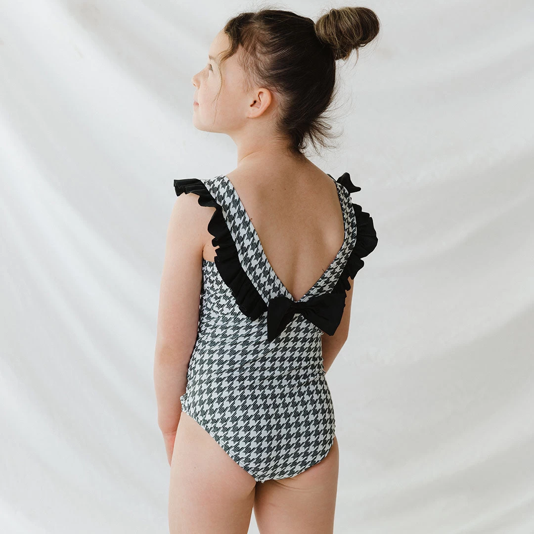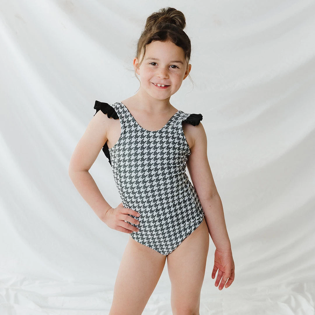 Thisย one piece houndstooth swimsuit makes for one stylish looking little with a timeless print and statement ruffles. Oh and bonus: There’s a set for you too! Coordinate with your little and make family pics dreams come true.