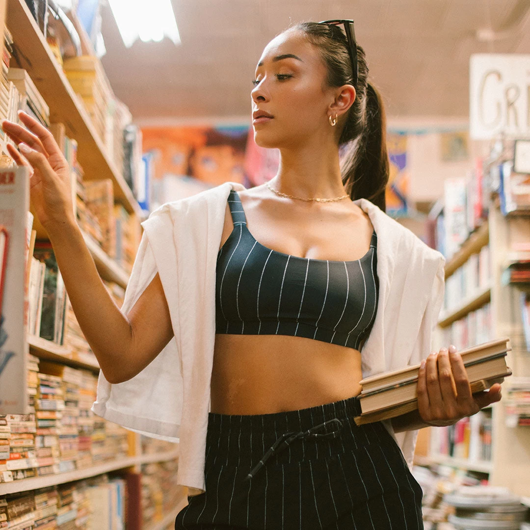 A navy stripe bra? It’s the classiest supportive sports bra ever! Our Momentum style has wide straps that keep you comfortable from the gym to the pool. That’s right, it’s a