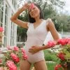 We love a great swim and sports bra combo! Who wouldn’t want to wear this bright floral top more often? With thick straps and a supportive band, this sports bra is ready to go the distance. Pink peonies are the bright touch of style that makes this top ready for fun in the sun.