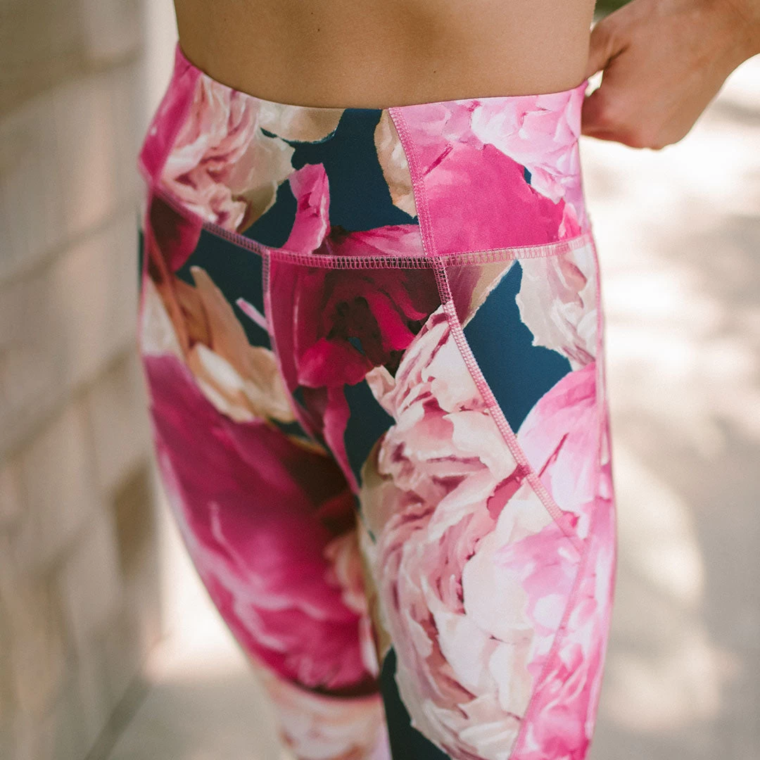 Meet our Movement Leggings! High-waisted, contoured, cropped, and sporting our stunning peony print, we are completely in love with these leggings. Don’t let the pretty design fool you; these pink floral leggings are ready to WORK. Supportive and comfortable, you’ll be reaching for these leggings for way more than just the gym.