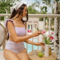 A bandeau off-the-shoulder swimsuit featuring the most darling ruffle strap…in a beautiful lilac! This purple bikini top just can’t get any prettier. Comfortable and classic, this bikini top is a joy to mix and match!