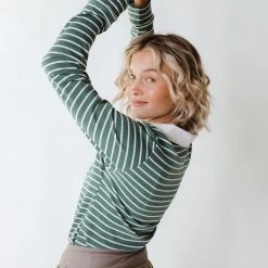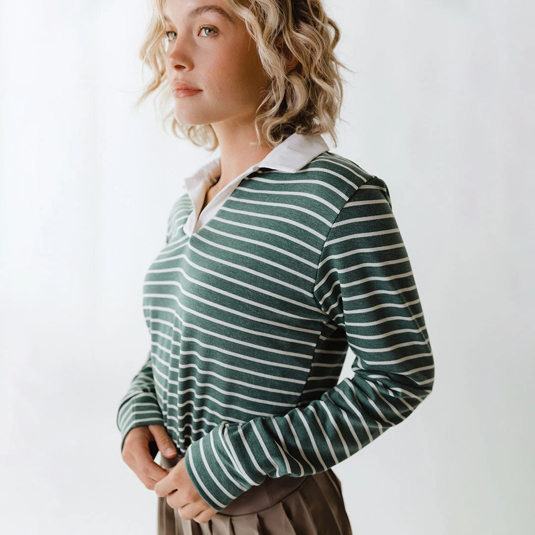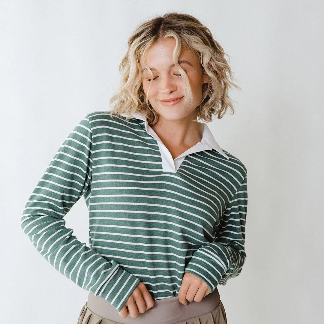 Preppy style meets super-soft comfort for this long-sleeve rugby tee! The collar is a crisp contrast to the hunger green stripes, no buttons required.