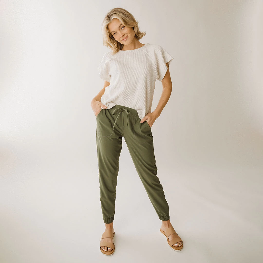 Our best selling joggers, beloved by petites, talls and everyone in between. Light weight, wrinkle-free, quick drying, and stretchy, these pants are perfect for travel, work, or home. Especially in this neutral Sage shade!