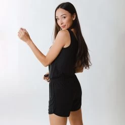 Whether youโre headed to the beach, brunch, or bedtime, this romper is perfect for feeling cozy and cute everywhere you go. Itโs a shorter version of our Tank Jumpsuit, and made from the softest bamboo materialโyou have to feel it to believe it! Plusโyouโll love the flattering elastic waist and scoop neck. Available in classic black.
