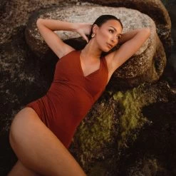 Our Shell Shock style features a halter neck with wide straps that cross at the back. Complete with a flattering v-neckline in the most gorgeous cinnamon red!