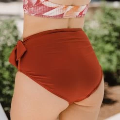 We love the mid-rise Simone style! Perfect coverage in amazing fabric, this is a gorgeous rust bikini bottom tied up with a bow. Mix and match this versatile color with a