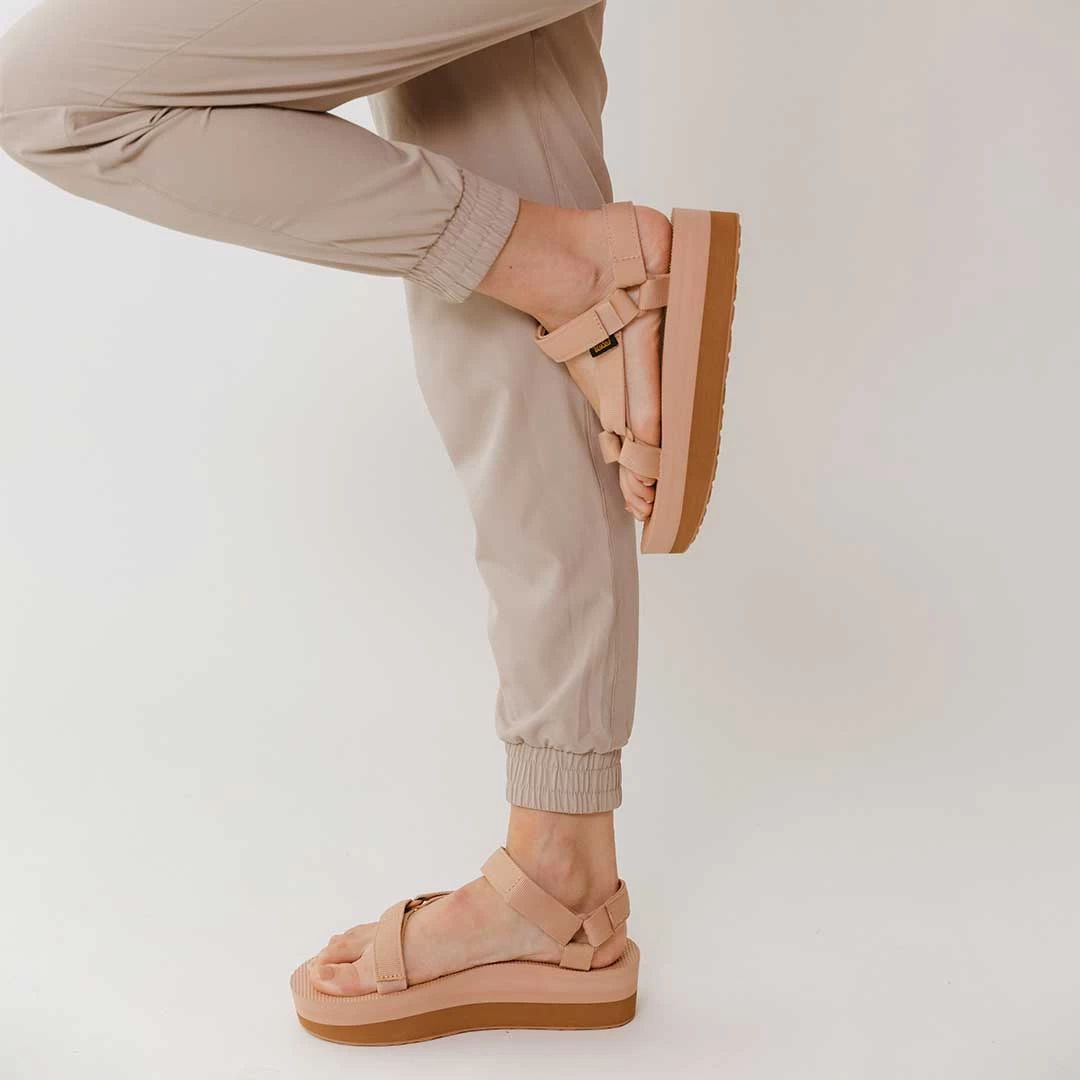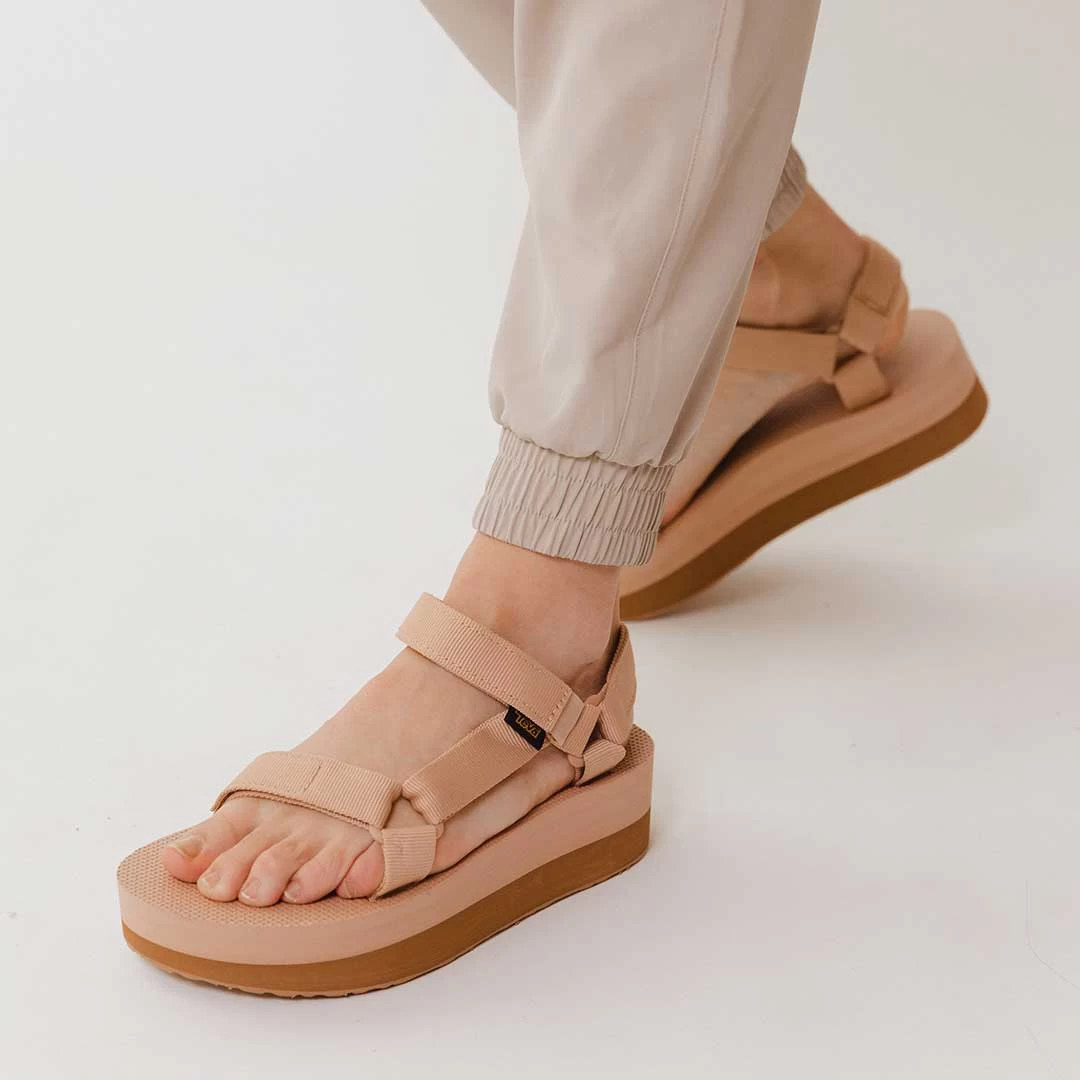 Take your look to new heights with the Teva Flatform Sandal! This color-blocked platform shoe features adjustable straps for the perfect fit in the prettiest Maple Sugar hue.