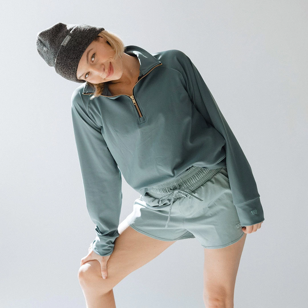 We made our Gotta Run 1/4 Zip pulloverย to last long after your workout ends! This women’s quarter zip features a dazzling gold zipper, and roomy pockets in a gorgeous grey blue shade we LOVE!ย