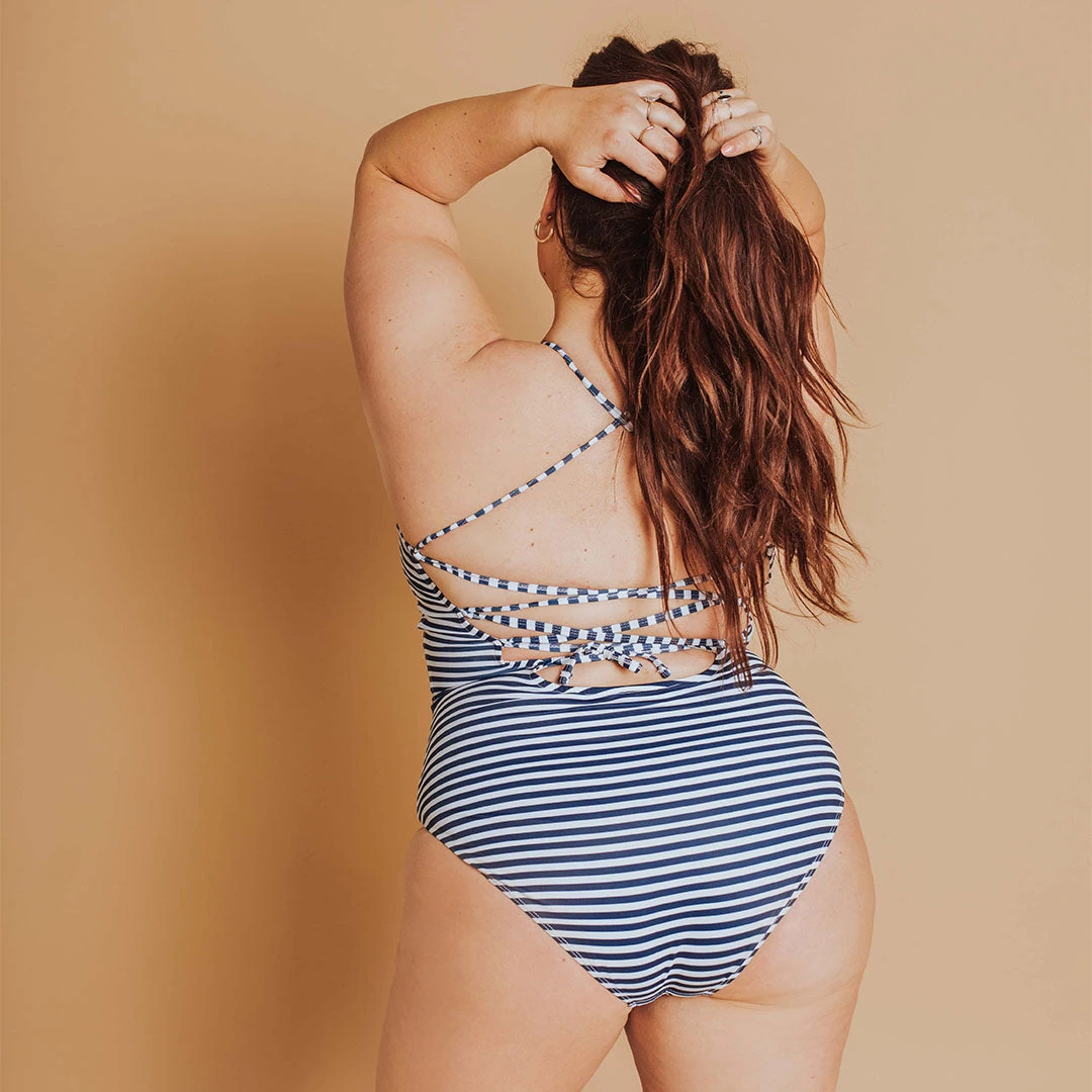 Our Weekender silhouette is quite possibly the most perfect swimsuit style known to woman. The perfect combination of classic elegance paired with boho-vibes (enter criss-crossing spaghetti straps that tie in the back). This Albion Fit one-piece swimsuit offers full coverage in front with contouring panels at the side to slim at the waist and accentuate those gorgeous feminine curves. The back is exposed with feminine, flirty overlapping straps.